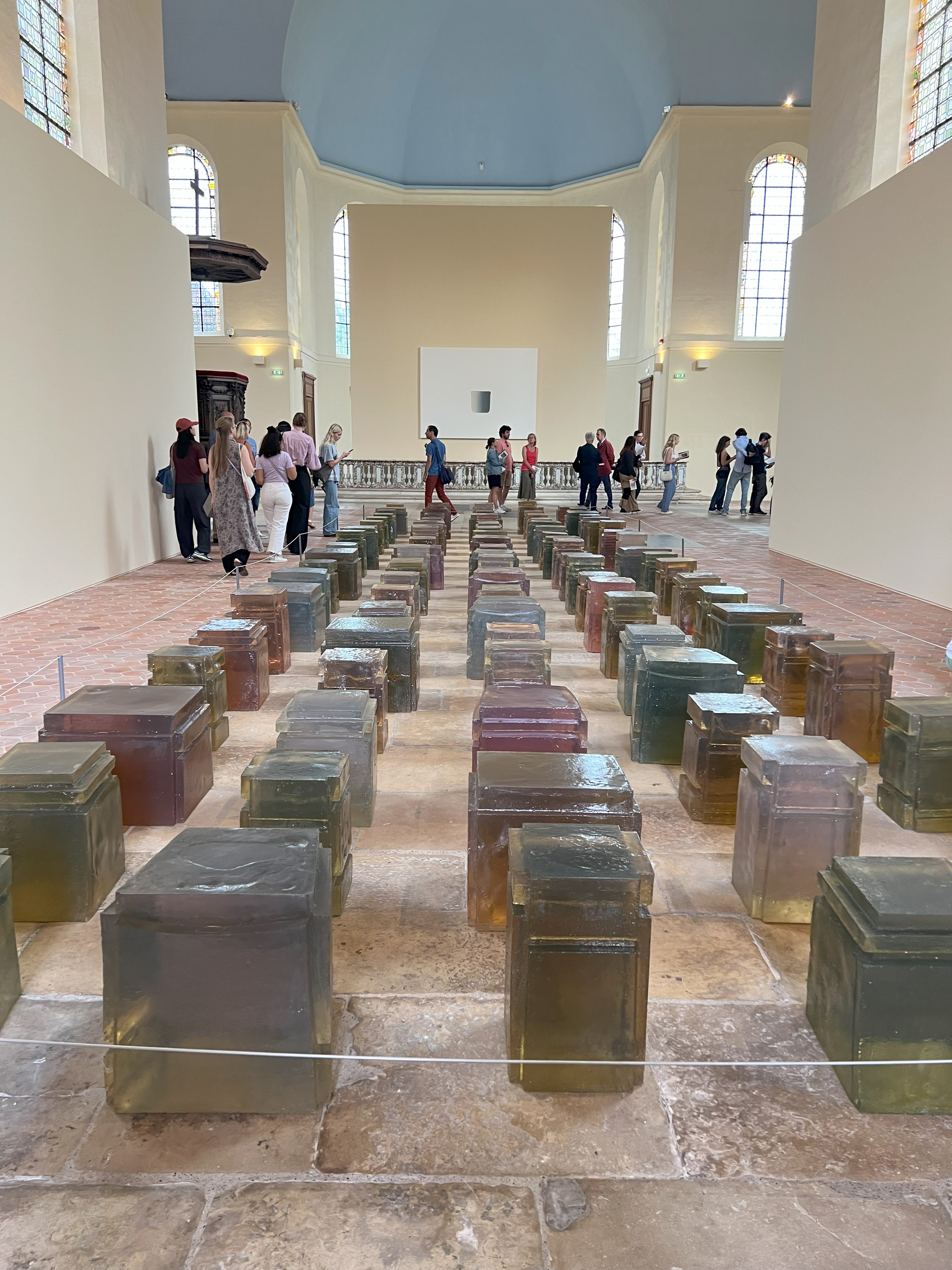 Ainsi, cette exposition fait écho à la seconde présentée par Kering lors des Journées Européennes du Patrimoine, d’art contemporain cette fois-ci et intitulée « Habiter le temps ». Rachel Whiteread représente à l’entrée de la chapelle Laennec une œuvre qu’elle réalise en 1995 Untitled ( One Hunderd Spaces ) qui se compose de nombreux blocs de résine coloré, installés de façon parallèle, rappelant une assemblée. Ce sont des moulages de dessous de chaises. L’artiste réalise ainsi un impression en négatif d’un espace, le dessous des chaises, pour matérialiser l’invisible, l’absence de celle-ci. Elle partage le même espace que les créations précédemment mentionnées dans la mesure où celles-ci transcendent le temps. Ces pièces ne sont plus habit(ll)er en pratique, mais elles le restent symboliquement. Elles portent en elles la forme du corps de ces femmes et clientes disparues, premières mécènes du Couturier.