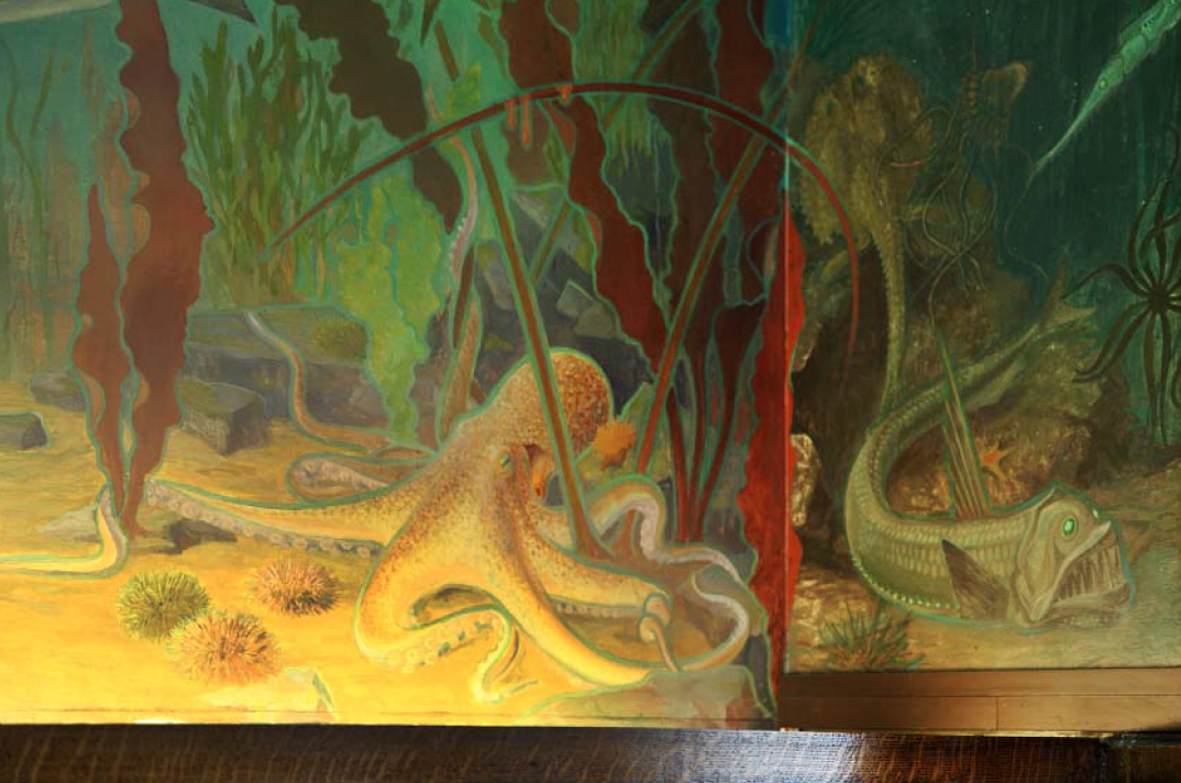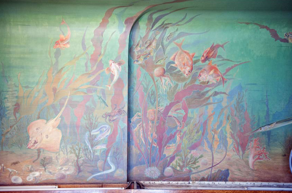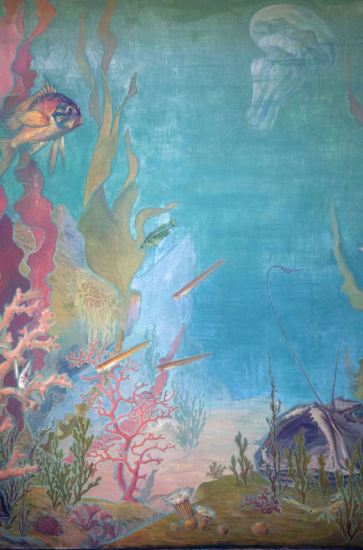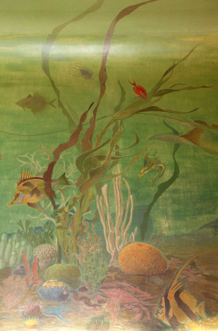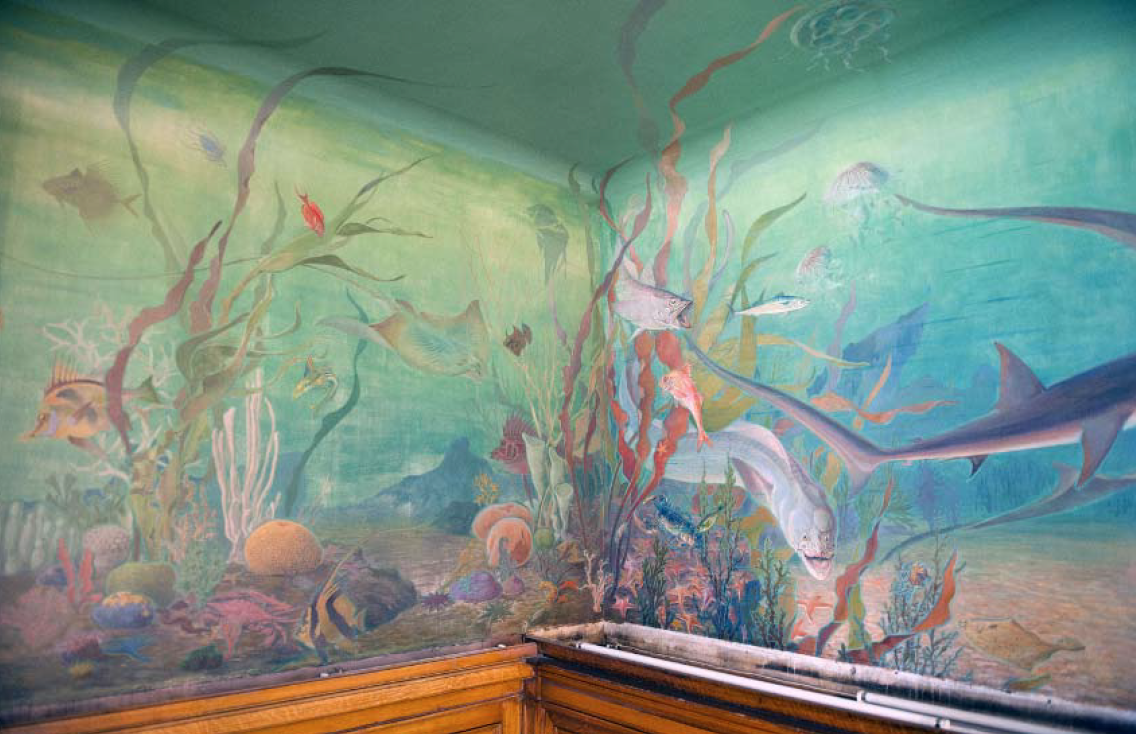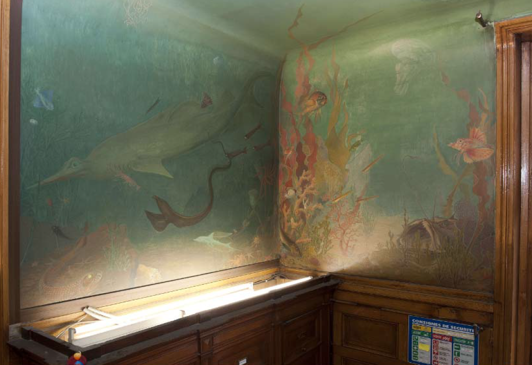 Dans le secrétariat de la Maison de l’Océan2 au 195 rue Saint-Jacques à Paris, l’artiste-décorateur Léon Laugier (1879-1962) plonge le visiteur sous la surface, dans un immergé terrestre. Des murs au plafond, cette salle est recouverte de toiles marouflées qui donnent une impression de baies ouvertes sur un fond marin recomposé.