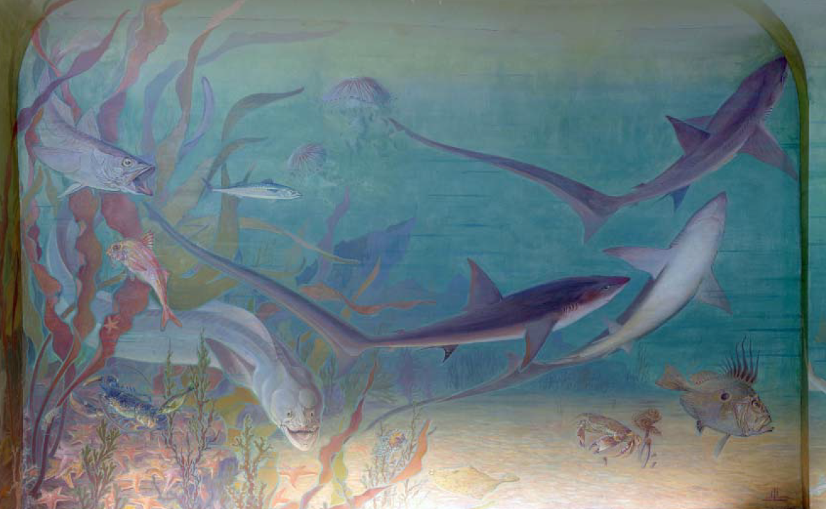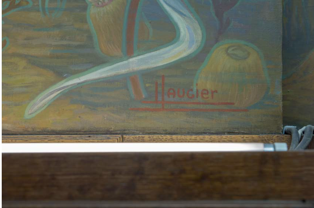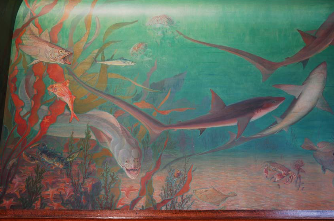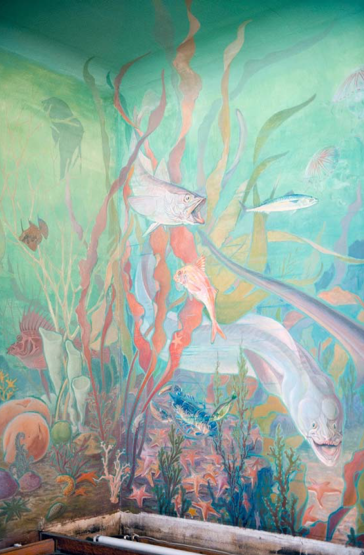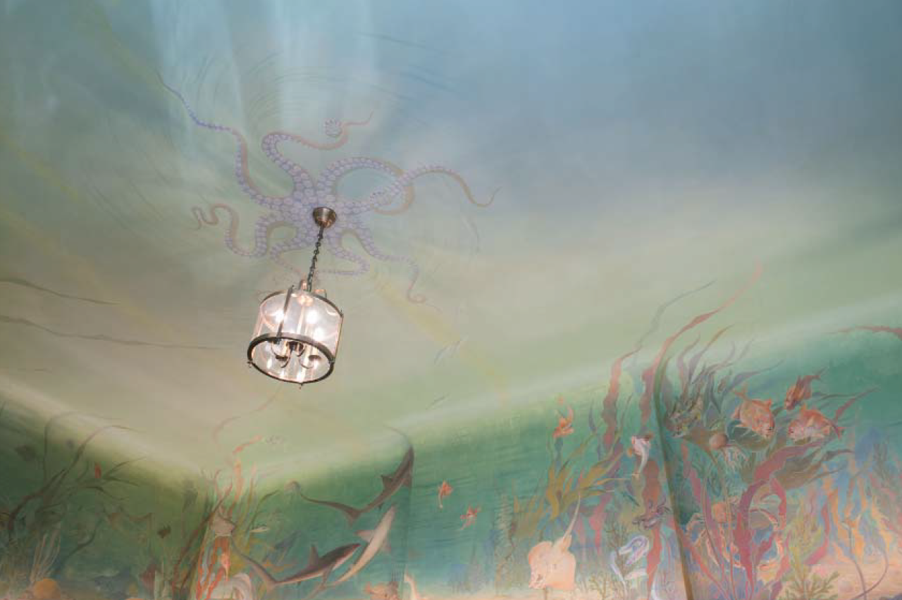 Dans le secrétariat de la Maison de l’Océan2 au 195 rue Saint-Jacques à Paris, l’artiste-décorateur Léon Laugier (1879-1962) plonge le visiteur sous la surface, dans un immergé terrestre. Des murs au plafond, cette salle est recouverte de toiles marouflées qui donnent une impression de baies ouvertes sur un fond marin recomposé.