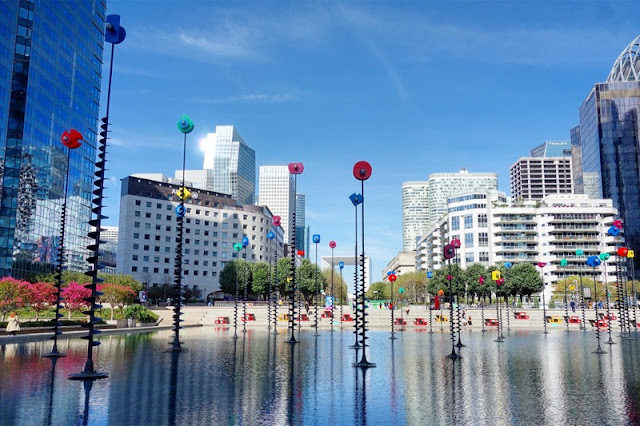 Le cas du Bassin du sculpteur grec Takis (1925-2019) situé à La Défense, installé en 1991 en est emblématique. Il s’agit d’une surface aquatique d’environ cinquante mètres de côté, installée au sein du domaine administratif, dans laquelle sont plantés 49 « feux lumineux multicolores » comme il les nomme, qui sont des tiges métalliques oscillantes entre 3,5 mètres et 9 mètres de hauteur, surmontées de formes géométriques colorées et de feux clignotants. Ces mêmes tiges produisent du son avec la participation artistique du vent à l’œuvre. Mais ce n’est pas ce qui nous intéresse ici. Dans ce Bassin, Takis, qui a décidé et délimité l’étendue d’eau, en fait la pièce maîtresse de son œuvre. C’est ici la surface de l’eau qui devient surface de l’œuvre, et les tiges ne servent qu’à accroître la majesté de l’élément naturel. En effet, ce qui compte ici est la réflection induite par la surface aquatique, encline aux jeux lumineux induits par les tiges, et ceux de la lumière du soleil, modifiées par la présence des architectures du complexe administratif. Au delà du simple vouloir artistique, s’adjoint ici un naturel hasard des éléments qui propulse la surface en moyen de réflection, de prolongement de l’image du monde ; pensons aux tiges surmontées de formes géométriques qui s’y reflètent, elles peuvent être entendues dès lors comme achevées puisqu’étant symétriquement complétées.