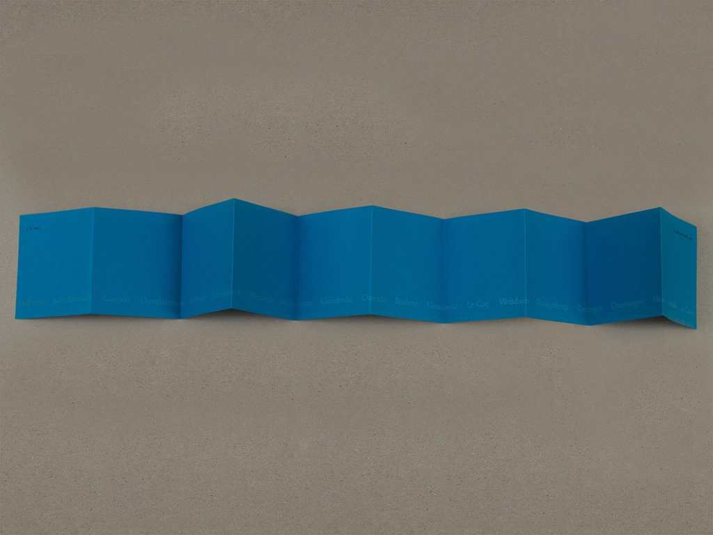 Dans son livre A la mer/ Aan Zee, datant de 2010, se déploie sur dix volets pliés, la côte belge. Les plis forment les vagues qui s’écrasent petit à petit sur la côte. Sur le dépliant, sont notés les arrêts de tramways desservant la côte. Le recto montre « l’aller » du trajet, alors que le recto représente « le retour ». Le papier forme ainsi, grâce à des droites en relief, un volume.