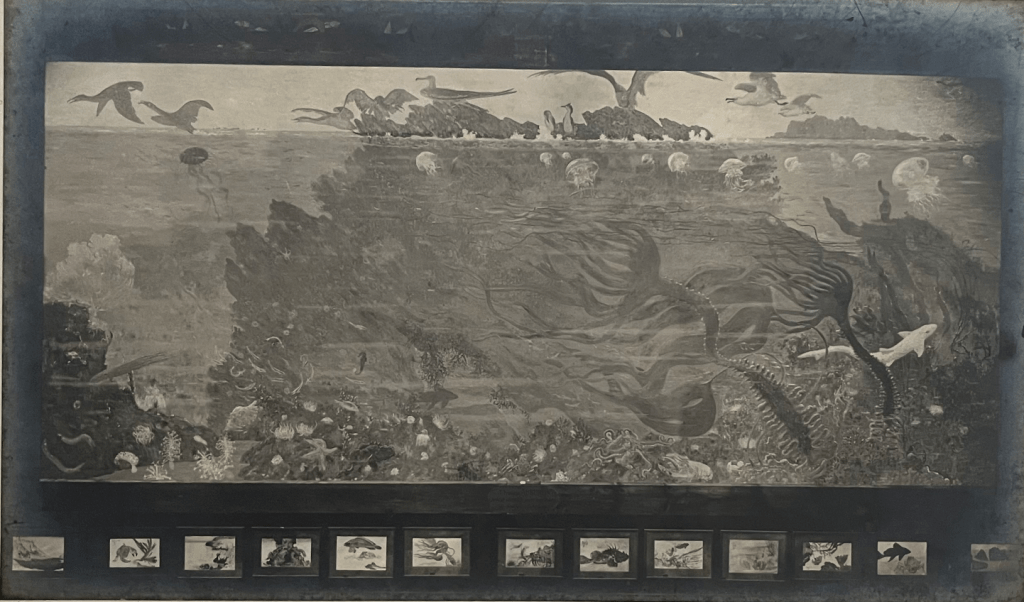 Fig. 5 AUBURTIN, Jean-Francis, Paysage au fond de la mer, 1898, ancien amphithéâtre de zoologie, amphithéâtre Milne-Edwards. Déposé en 1968. Photo : Elisa Steciuk à partir d’un tirage ancien sur plaque de verre des frères Moreau (1898, collection privée), éditeurs et photographes.