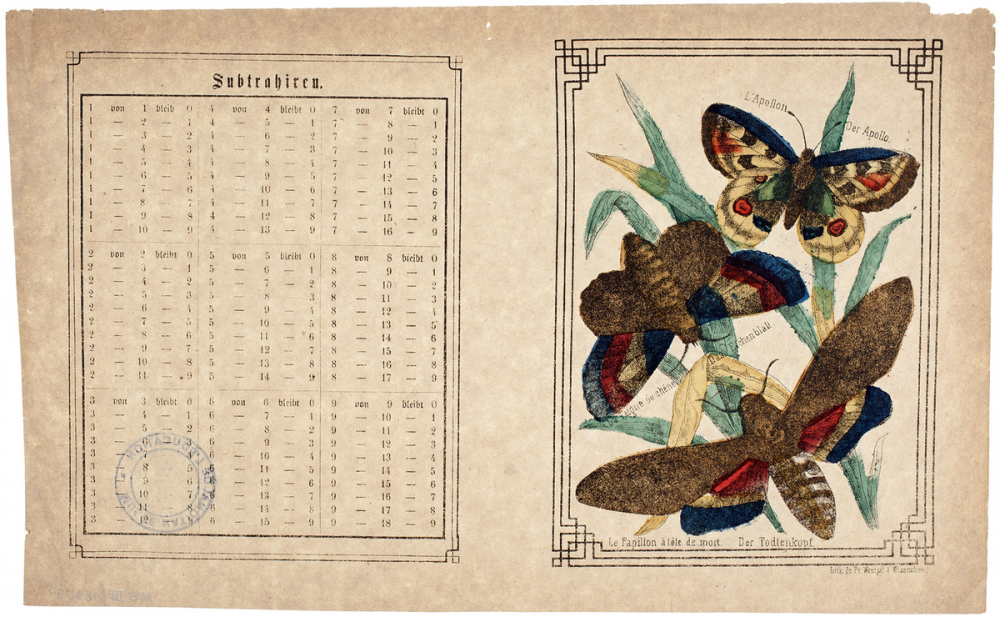 Anonyme, Le Papillon à tête de mort – La teigne de chêne – L’apollon, couverture de cahier, [vers 1880], papier, 210 mm x 165 mm, Wentzel (Fr.) (Wissembourg), Rouen, musée National de L’Éducation, numéro d’inventaire : 1979.18909.3.