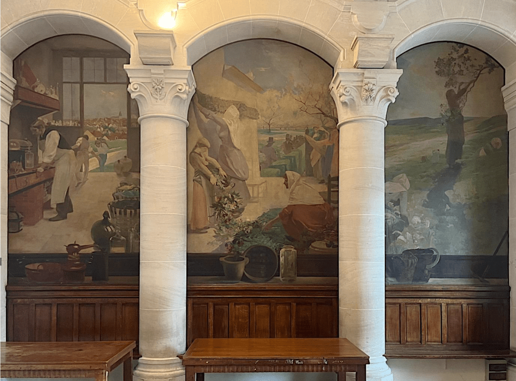 Fig. 4 BESNARD Albert, Le laboratoire (à gauche), Le traitement des simples (au centre), La cueillette des simples (à droite), 1883-1888, hall d’honneur de la Faculté de Pharmacie, Paris. Photographie : Elisa Steciuk.