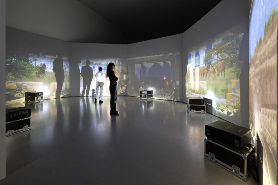 Cette œuvre de Tacita Dean (1965 – ) est suivie par une œuvre tout aussi cataclysmique. Six écrans de projection m’enveloppaient, m’éloignant de tout repère spatio-temporel. Sur ces six panneaux, je regarde un paysage désolé, le monde après Tchernobyl, un monde épuisé et ravagé. Dans Chernobyl (2011 ; installation vidéo, six projecteurs, six lecteurs vidéo ; 14 min 27 sec), l’artiste américaine Diana Thater (1962 – ) déroule des images de paysages dévastés, projetés sur des toiles tendues, marqués par les retombées de l’explosion nucléaire. Je souhaite à tout prix fuir cet endroit terrifiant, dans lequel j’ai perdu tout mon sens commun. Toutefois, ultimement, je ne peux échapper aux sentiments d’angoisse et d’impuissance, comme si je ne pouvais arrêter le déclin d’un monde en déliquescence. L’artiste mélange l’installation vidéo et l’architecture, et ce de manière immersive. Ces paysages ravagés par les catastrophes nucléaires sont à l’image des no man’s land, des friches industrielles abandonnées et des lieux dont la fertilité a été exploitée et épuisée. Ces lieux de lisière, de frontière, sont aujourd’hui les forêts et les campagnes d’hier.