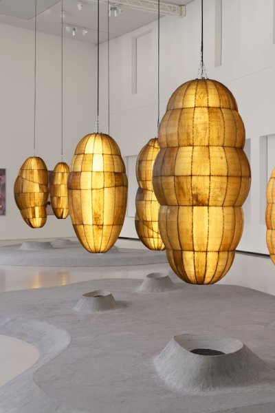 Pour poursuivre cette quête parmi les paysages souillés, je fais ensuite l’ascension de la rotonde. Perché dans une salle au sommet du dôme, Robert Gober (1954 – ) fait sensation, intrigant quiconque oserait s’approcher de plus près pour jeter un coup d’œil. Il faut rejoindre la file d’attente, attendre patiemment quelques moment pour apercevoir la cascade cachée au dos d’une veste de costume, Waterfall (2015 – 2016 ; laine, coton, bois, peinture sur mastic époxy et résine, pompes recyclées, lumières et eau, 292 x 170 x 163 cm). Peut-être en hommage à Marcel Duchamp et son œillère – Étant donnés : 1. La chute d’eau, 2. Le Gaz d’éclairage… (1946 – 1966), Philadelphie, Philadelphia Museum of Art) – il n’est plus question de vivre dans la nature, mais de la porter en soi, de la protéger de l’empiètement humain. Comme enfant du monde, chacun de nous porte une pièce de cette mère primitive à laquelle nous devons allégeance. Néanmoins, pensais-je, est-ce réellement un moyen de la protéger que de la porter en soi ? Ou s’agit-il d’une appropriation rusée et avare des Hommes, une exploitation de la nature par la culture ? Ces interrogations déconstruisent la plasticité illusoire du paysage artistique. Ces questions démantèlent les conventions picturales du paysage pour les reconstruire, en accord avec notre monde contemporain. Il n’est plus question de mettre en place des perspectives atmosphériques et de rendre compte d’une topographie d’un lieu ni de faire une ode à la beauté de la Nature, bucolique, champêtre, à la fois microcosme de nos émotions et macrocosme de notre société. Non sans une attraction voyeuriste, la veste noire dévoile malicieusement pour satisfaire l’insatiable curiosité humaine et sa pression sur la nature. Après avoir quitté cette pièce bondée, je continuais sur la gauche, et j’entrais dans une salle déconcertante. Je me retrouvais entourée de sons épars d’insectes volants, d’abeilles, de mouches et de moustiques. Ma réaction première fut de vouloir m’enfuir de ce qui me paraît être l’enfer sur terre. L’artiste sud-coréenne réussit son but de jouer avec nos sens. Juste sous mes yeux, des ruches imposantes et assourdissantes se dressent. Ces cocons, faits de papier orange, sont éclairés, me permettant d’observer les insectes flétrissants qui voltigent à l’intérieur. Avec Biologizing the machine (2023 ; varec, aquazole, glycérine, crêpeline, acrylique, led, insectes animatroniques ; dimensions variables), Anicka Yi (1971 – ) inverses l’ordre naturel auquel nous sommes habitués : nous devenons les êtres vivants invisibles, tandis que les insectes revendiquent nos terres.