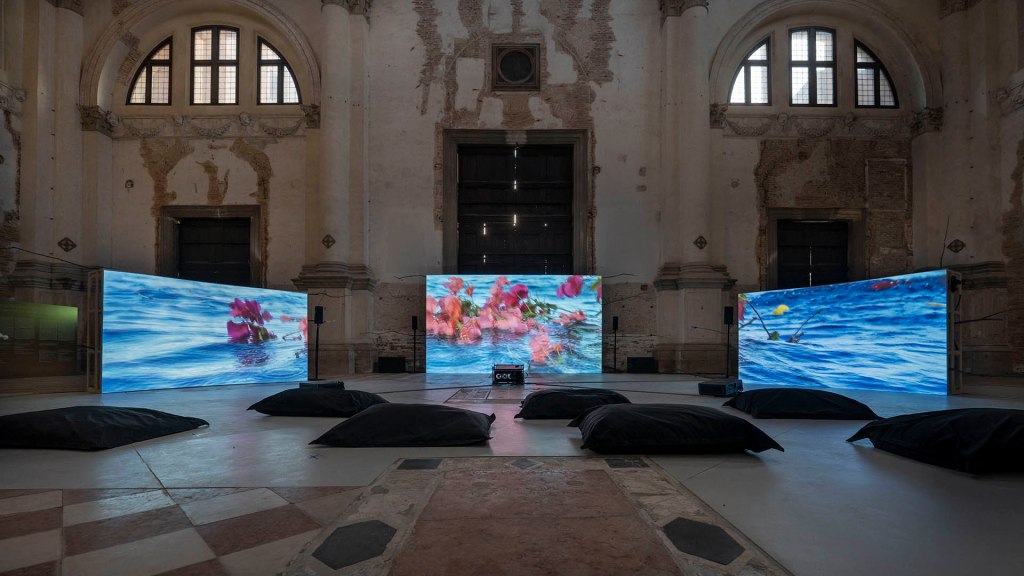 Un dernier mot que je consacrerai à l’expérience opposée de ce qui pourrait constituer une catabase, une voie royale vers l’enfer. Je procède doucement vers le sous-sol avec une once de curiosité. Loin d’un séjour dans les ténèbres, Lerato laka le a phela le a phela le a phela (Mon amour est en vie, en vie, est vivant ; 2022 ; installation vidéo ; dimensions variables) est un dispositif filmique qui esquisse une plage paradisiaque. Dans un espace bleu-mer, sur de doux matelas entourés de bougainvilliers et de noix de coco, l’artiste sud-africaine, Dineo Seshee Bopape (1981 – ) nous invite à s’allonger et à s’immerger dans cet espace méditatif. Bercé par la musique, on se laisse porter par la poétique du lieu, une œuvre d’art total dans laquelle les fleurs flottent à la surface de l’eau. L’artiste charge sa pratique artistique d’un sens socio-politique. Il s’agit ici d’une ode à la mer, à l’eau, le trait commun et nécessaire à toutes les formes de vie. Peut-être rivière du Léthé, le fleuve de l’oubli, l’environnement aquatique reste pourtant le dénominateur commun de tous les êtres vivants. Cette berceuse maintient en suspend une calme grandeur qui captivent les cœurs et les esprits. Par conséquent, nous sommes placés face à la beauté du monde et à son infinie étendue. Maintenant, nous sommes prêts à sombrer dans ce silence sacré. J’écoute avec émotion et piété les litanies de ces bruits, exprimant une profonde connexion avec les merveilles de Mère Nature.