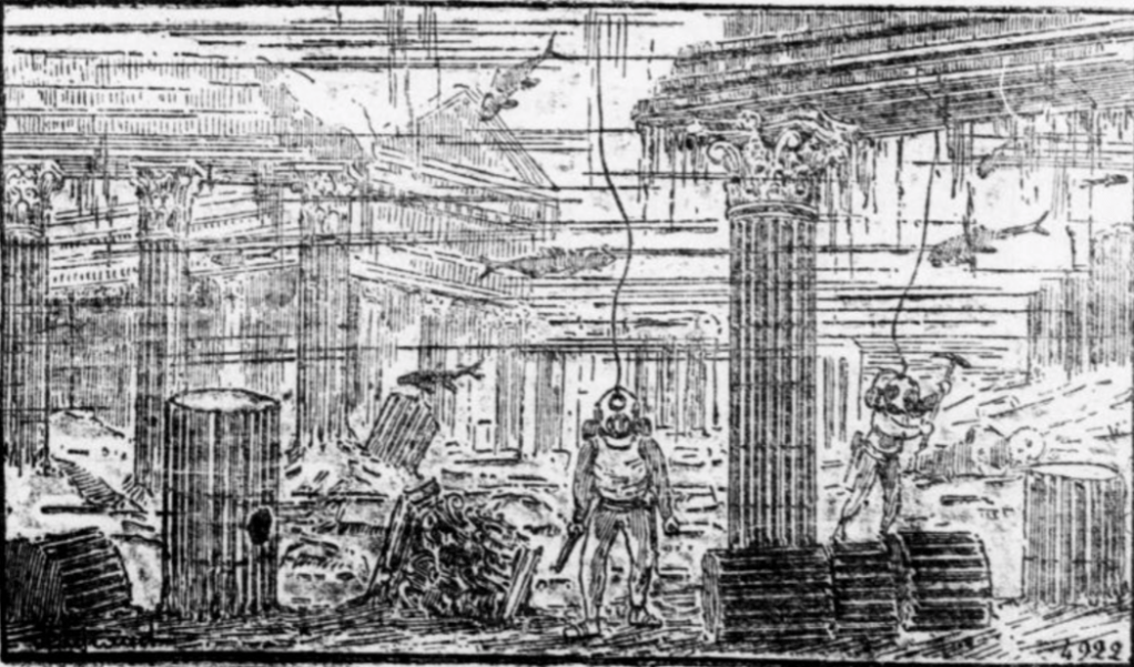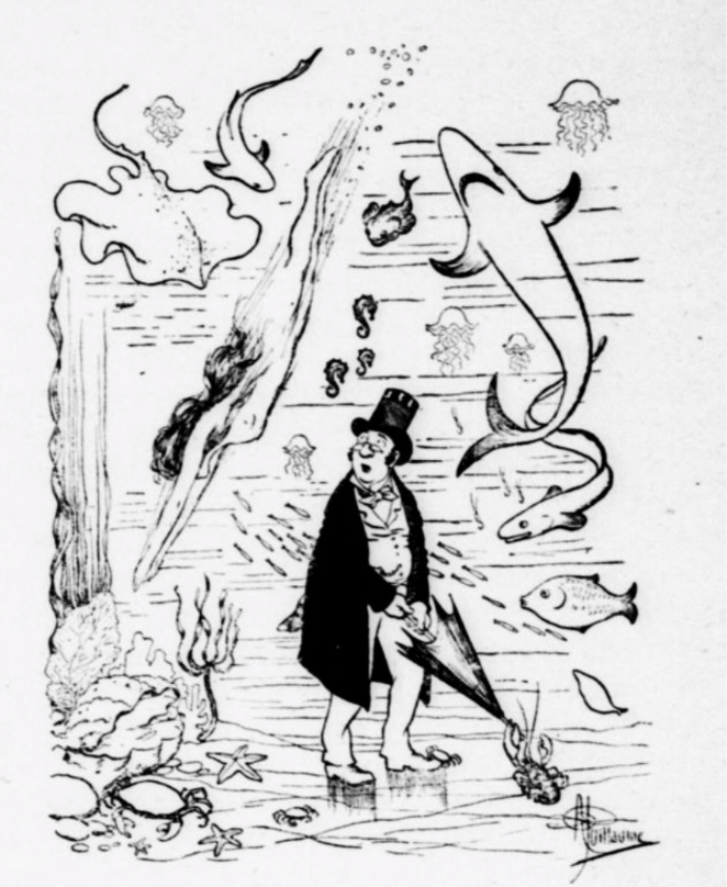 « Puis, des scaphandriers apparaissent, armés de puissantes lanternes électrique, et se livrent à leurs travaux sous les yeux du public. Et les poissons, accoutumés à leurs évolutions, n’en sont pas effrayés. J’ai vu là […] tous les genres de poissons de mer, absolument familiers, venir prendre des crevettes dans la main des scaphandriers. »