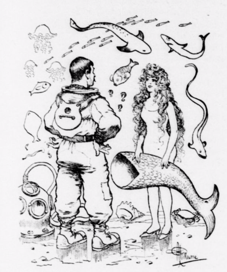 Dans la culture visuelle appliquée au monde sous-marin à la fin du XIXe siècle, l’union entre la modernité industrielle et technique et le fantasme poétique, est incarnée par l’association du scaphandrier et de la sirène (Fig. 4). Il est donc évident pour les frères Guillaume d’intégrer des prestations de sirènes aux côtés des scaphandriers afin d’incarner au mieux l’imaginaire sous-marin du siècle.