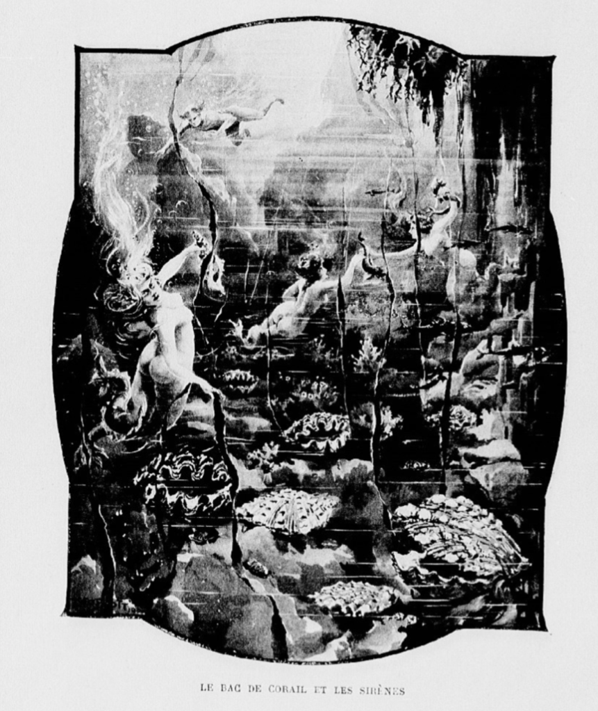 Ainsi, des « théories de sirènes aux longues chevelures entremêlées d’algues flottantes, et qui semblent s’agiter au sein même des flots »19 offrent alors à certaines heures de la journée leurs silhouettes ondulant dans le bac de corail (Fig. 5). Des musiques savamment choisies, peut-être pour leurs sonorités oniriques, accompagnent les prestations de ces femmes costumées20. Dans L’Événement du 22 mai 190021, le journaliste Georges Duval rédige une courte fiction mettant en scène Monsieur Bérenger, un visiteur sceptique de l’Aquarium.