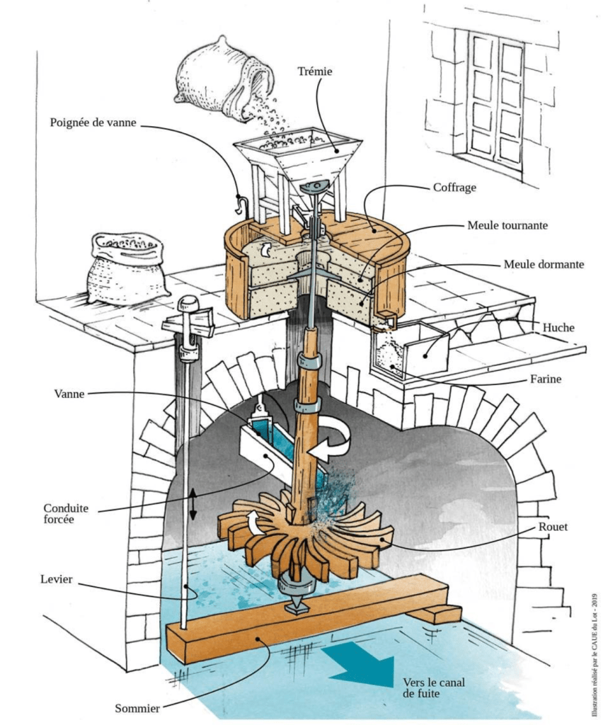 Commençons par la plus essentielle des activités : la mouture. La majeure partie du travail de mouture se focalisait autour de deux postes : les meules pour ajuster la finesse de la farine et s’assurer que le grain était bien broyé et les diverses vannes (fig.1) pour contrôler le flux d’eau et donc la vitesse de rotation des meules. Si le contrôle de l’eau était avant tout important pour une question de sécurité et de durabilité des meules (en évitant qu’elles ne se frottent inutilement et s’usent), il pouvait également être crucial pour mesurer avec précision la quantité d’eau disponible, en particulier durant l’été ou les pluies se faisaient plus rares et les rivières étaient plus sèches. De nombreux moulins de villages installés sur des petits cours d’eau devaient alors être alimentés par des réservoirs artificiels remplis tout du long de l’année par la pluie. Par conséquent, la mauvaise gestion du stock pouvait signifier le chômage technique pour le meunier qui ne pouvait plus activer son installation. Cette immobilisation pouvait rendre pénible le quotidien des villageois, les obligeant parfois les villageois à devoir rejoindre un autre moulin, impliquant la nécessité de porter son grain sur plusieurs kilomètres. Dans le pire des cas, le village était trop isolé pour avoir un autre moulin à proximité, les villageois pouvaient se voir privés de farine et donc de pain (très présent dans la l’alimentation médiévale) et par conséquent une perte éventuelle de la réserve de grain destiné à l’alimentation.