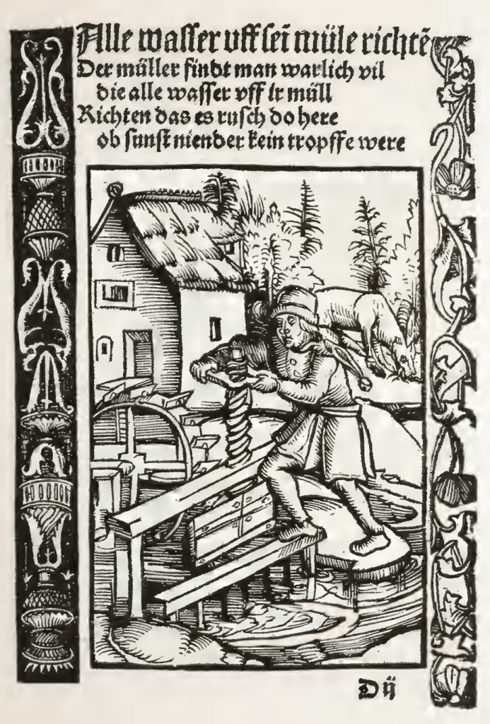 Le moulin est une pièce d’orfèvrerie médiévale dont les pièces et la structure étaient essentiellement faites en bois. Installation souvent fragile pouvant facilement être rasée (ou du moins endommagée) lors des violentes crues des grands fleuves, le moulin hydraulique restait un investissement important pour son propriétaire qui devait s’assurer de son bon fonctionnement et de son entretien pour en garantir la pérennité et sa rentabilité sur le long terme. Il en était du rôle du meunier. Chef d’orchestre du moulin dont il était gardien, le meunier était à la fois artisan, administrateur, producteur et commerçant. Faisant le lien entre la population, qui dépendait principalement des moulins pour se nourrir, et le propriétaire, seigneur des terres concernées ou monastère influent de la région, le meunier était une figure bien à part dans le paysage social médiéval. Si nous avons déjà pu mentionner la question sociale du moulin1, intéressons-nous ici plus en détail au travail quotidien du meunier.