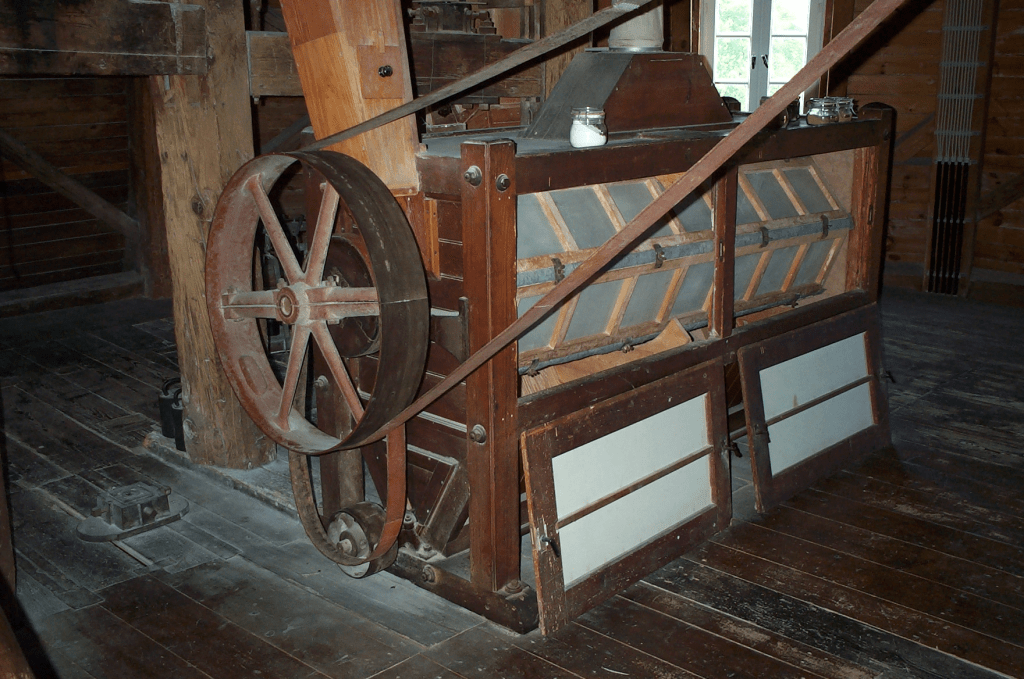 Se démocratisant au XIXème siècle, les moulins furent également équipés d’un blutoir (fig.3) qui fonctionnaient essentiellement comme de très grands tamis permettant d’obtenir une farine toujours plus fine et pure. L’installation pouvait être connectée au mécanisme hydraulique pour automatiser son mouvement.