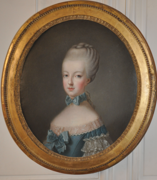 Cette attention au décor qui vise à nous plonger dans l’atmosphère de la fin du XVIIIe est conjuguée avec un déploiement impressionnant de figurants et de costumes. Assurément, le film se distingue par un défilé monumental de robes, de plumes, de perles et autres vêtements de la période ー d’ailleurs, il remporte l’Oscar des meilleurs costumes en 2007. Milena Canonero, qui est à la tête du département des costumes, étudie attentivement le travail de Rose Bertin (1747-1813), modiste réputée de la reine, afin de reproduire le plus fidèlement possible les habits portés à la fin du XVIIIe siècle. Ainsi, on retrouve les éléments majeurs de la garde robe féminine des années 1770 : le corsage noué sur le devant, typique de la robe à la française, les manches en pagode ainsi que les ornements tout autour du manteau. La mode est aussi une clé de lecture afin de comprendre l’évolution psychologique du personnage. Au début du long métrage, les tenues sont teintées de couleurs pâles, dépourvues de motifs. Citons en exemple la robe bleu claire portée lors de la rencontre entre la princesse, le dauphin et le roi Louis XV (Fig. 3.) qui s’inspire directement d’un tableau de Jean-Baptiste Charpentier (1728-1806), traduisant la jeunesse et l’innocence (Fig. 4.)3.