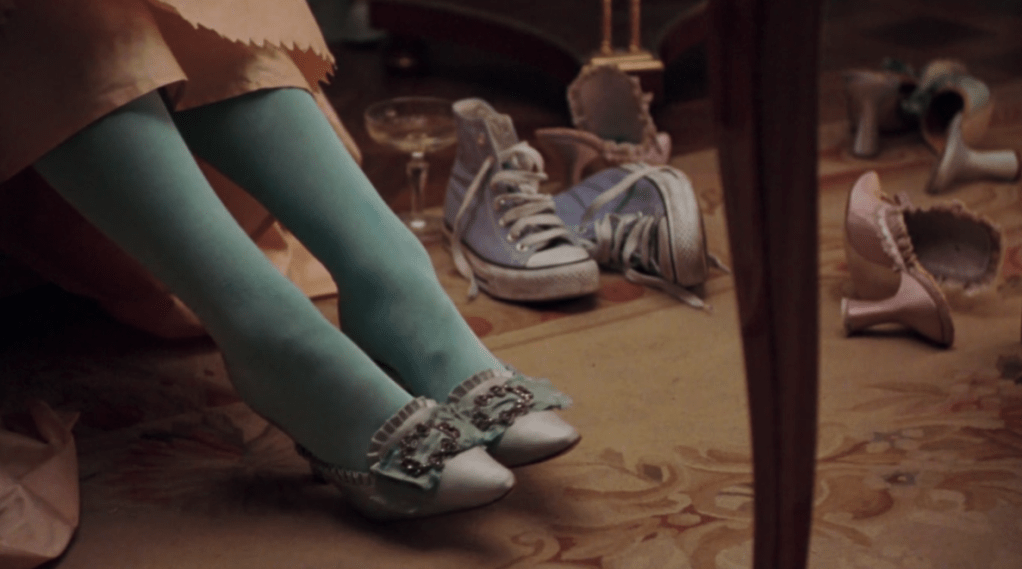 Pourtant, malgré la volonté de se rapprocher au maximum d’une véracité historique au travers des costumes et des décors, le film assume une certaine esthétique de l’anachronisme. Cela passe premièrement par la bande-son. Les notes de clavecins se mêlent à celles de la guitare électrique et de la batterie. Si elle occupe une place aussi particulière dans le film  c’est qu’à l’image du vêtement, elle participe de la création d’un véritable portrait psychologique de l’héroïne. Les titres rock de la fin des années 80 de New Order, The Strokes en passant par Aphex Twin 一 qui étaient écoutés par la réalisatrice durant sa propre adolescence一 insistent sur l’aspect juvénile du film et s’apparentent à une échappatoire, tandis que les morceaux se rapportant à la fin du XVIIIe siècle composés par François Couperin permettent la création d’une ambiance pesante. De ce fait, loin de s’opposer, les musiques s’articulent en un réseau incarnant à la fois le passage de l’adolescence à l’âge adulte mais aussi l’image de la cour de Versailles comme une prison.4 Ainsi, il ne s’agit pas ici d’une simple maladresse anachronique mais d’un mélange soigneux entre éléments vérifiables sur le plan historique, et d’autres empruntés à l’époque contemporaine de sa réalisation. Cette esthétique de l’anachronisme assumée se matérialise à l’image par  la longue séquence de l’essayage. Les plans successifs sur les chaussures, les verres de champagne et les différentes pâtisseries marquent une accélération dans le film, moment choisi par la réalisatrice pour y insérer une paire de converse parme au cœur des nombreux escarpins (Fig. 7).