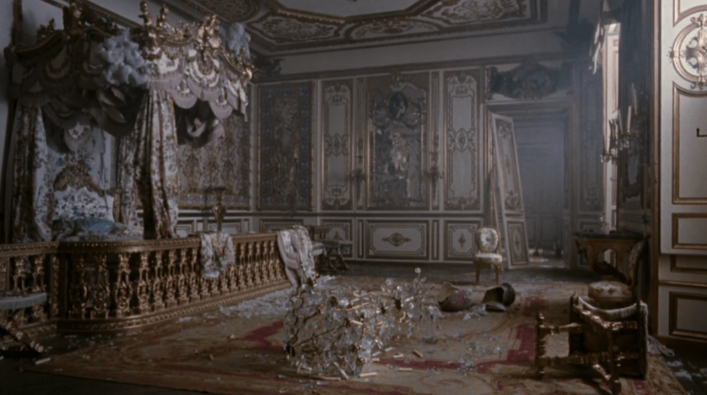 Coppola appelle aussi le spectateur à réfléchir sur la conscience de classe. L’opulence des repas, des orgies, des robes et des bijoux qui inondent tout le film s’apparente à un doigt d’honneur au Tiers-Etats. En se fondant sur une vision du XVIIIe siècle digne des écrits des frères Goncourt5, la réalisatrice joue sur les connaissances du contexte sociopolitique de cette époque par le spectateur, suscitant son indignation. Si le film semble lisse dans son approche de la violence, il faut voir que les horreurs de la Révolution semblent déjà en marche. La cruauté du film réside dans le choix de la réalisatrice de conclure son biopic sur les journées des 5 et 6 octobre 1789 marquant le départ du couple royal et de leurs enfants de Versailles. À l’instar du contexte socio-politique, Coppola sait que le spectateur connaît les circonstances de la mort de Marie-Antoinette. Ainsi, ce choix de maintenir hors champ ces questions politiques est délibéré : le spectateur est à l’image du peuple qui connaît le sort inéluctable qui attend le couple royal. Le dernier dialogue entre Marie-Antoinette et Louis XVI assis dans le carrosse qui les conduit à leur mort certaine confirme cette impression : « Admirez-vous votre allée de tilleuls ? Je fais mes adieux.  ». Le film se conclut par un plan sur les appartements de la reine saccagés, métaphore de sa chute (Fig. 10).