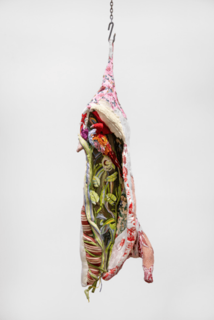 Tamara Kostianovsky a grandi à Buenos Aires, où elle a découvert, dans le cabinet de chirurgie esthétique de son père, les dessous de la chair humaine : os, ligaments et textures internes se sont révélés à elle comme une nouvelle palette de couleurs. Cette expérience a profondément marqué son approche artistique.Lorsqu’elle commande des plumes pour une œuvre, elle reçoit un faisan mort – premier contact direct avec un animal sans vie. En le suspendant par les pattes, les ailes se déploient, créant une image saisissante qui évoque, selon l’artiste, une crucifixion. Dès lors, la chair devient une thématique centrale dans son travail. Elle explore ce trait commun à tous les êtres vivants – arbres, oiseaux, humains – qu’elle rassemble dans son exposition intitulée La Chair du Monde. À travers l’upcycling de vêtements, tissus et tapisseries, Tamara Kostianovsky crée des sculptures qui interrogent notre lien universel à la matière vivante, de manière tout à fait vraisemblable. Tout en assumant cette proximité avec les grands maîtres anciens, comme Rembrandt, et en créant une parenté flagrante, l’artiste se distingue en ajoutant des oiseaux qui prennent vie par exemple dans les bœufs écorchés.