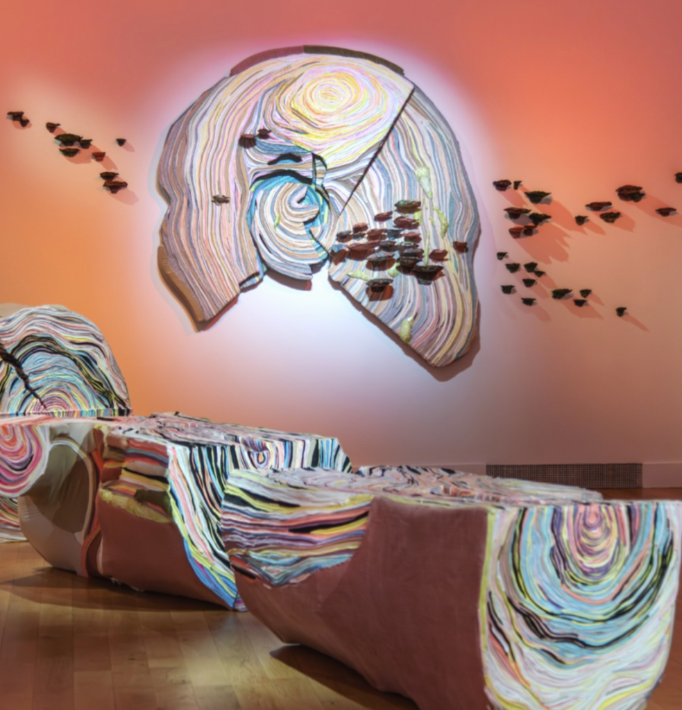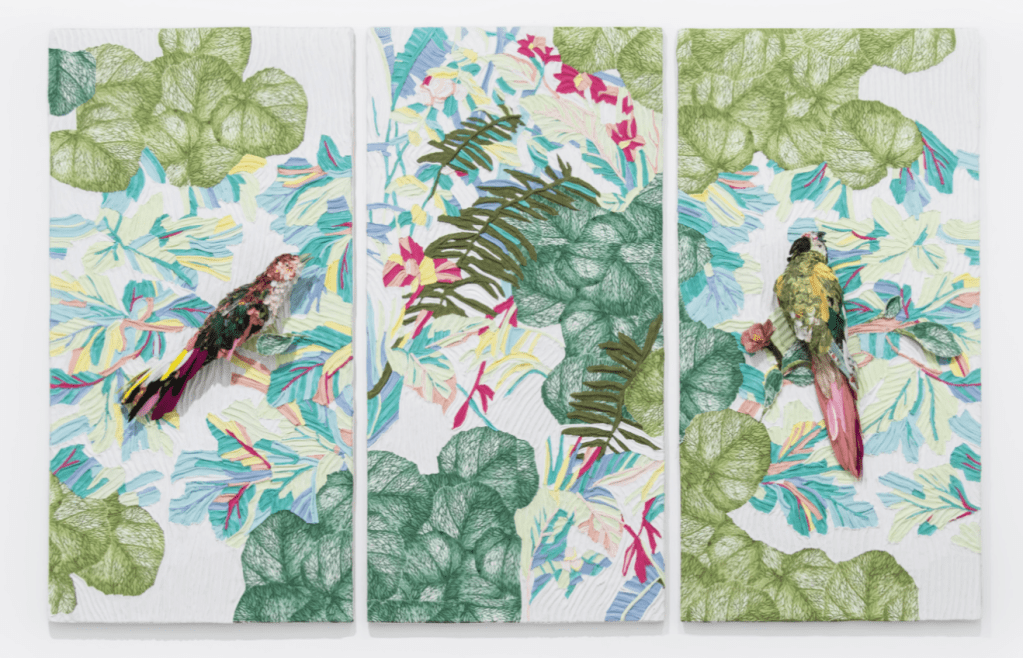 Au deuxième étage, les sculptures de carcasses de bétail, intégrées à la collection permanente du musée, jouent avec l’illusion de la vie : animées par des moteurs rotatifs, ces formes figées reprennent un semblant de mouvement, brouillant la frontière entre le réel et le faux. Vraie carcasse d’oiseaux de loin, lorsque le spectateur se rapproche, il peut distinguer le travail minutieux de la couture avec des tissus recyclés.