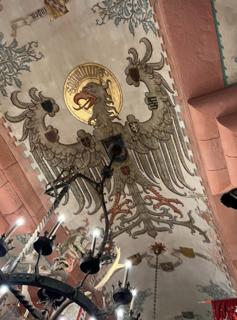 Outre ces débats concernant la qualité de restauration, le travail d’Ebhardt était dirigé par Guillaume II qui attendait de toute évidence un produit de propagande. La volonté de restaurer le château dans son état XVème siècle, époque où il était au sommet de sa valeur militaire et un chef d’œuvre parmi les bastions de la région, n’était pas anodine. Outre la Germanité, Guillaume II restaura à sa manière l’honneur de l’Alsace en se ramenant à cette grandeur passée3. Ainsi, il est possible de retrouver à travers tout le château des références au Kaiser et à sa dynastie. Que ce soit les poêles qui portent les initiales de l’Empereur ou les portraits des femmes de sa famille dissimulé dans les ornements muraux. Bien sûr, il est impossible d’aborder l’aspect propagandiste du château sans mentionner la salle du Kaiser. Cette pièce centrale dont les imposantes et remarquables fresques furent peintes par l’artiste Strasbourgeois Léo Schnug (1878 — 1933)4, reconnaissable à son trait unique s’inspirant des fresques médiévales, nous rappelle la longue histoire militaire du château. Au plafond, un imposant aigle impérial (Fig. 3) au regard sévère et carnassier. Les blasons qui ornent le rapace, la couronne du Saint-Empire-Romain-Germanique ainsi que l’imposante taille de ce dernier envoie un message clair : « Ici vous êtes en terre Germanique ! ».