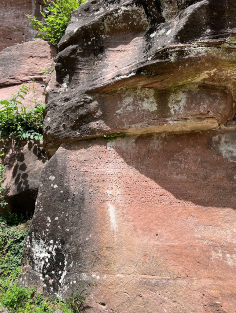 Cette volonté de faire du Haut-Kœnigsbourg est une évidence appuyée par plusieurs éléments supplémentaires. Tout d’abord dans une lice5 inaccessible au public, gravé dans la roche (Fig. 4), figurent un texte faisant l’éloge de Guillaume II écrit par Bodo Ebhardt :