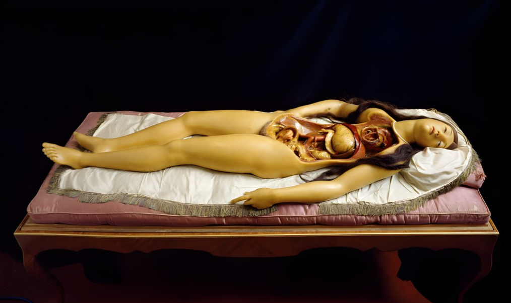 Sculptures démontables, les Vénus Anatomiques dévoilent leur intérieur sous plusieurs couches à retirer. Ces mannequins de cire hyper naturalistes étaient destinés aux étudiants en médecine au XVIIIe siècle, pour étudier l’anatomie humaine. Trop réalistes, trop sexualisées, les vénus suscitent le malaise chez les spectateurs contemporains. Outil pédagogique, et objet de fantasme, elles ravissent Sade et dégoûtent Elisabeth Vigée Lebrun.