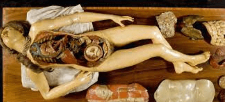 Le corps, en raison de sa tridimensionnalité ne peut être reproduit et parfaitement représenté par le dessin anatomique, qui, par sa planéité ne peut rendre compte de l’épaisseur des membres ni de la texture de la chair2. La cire, matériau utilisé dès l’antiquité dans le cadre de rites funéraires, à laquelle on prêtait des vertues magiques, fut utilisée à la fin du XVIIè siècle à Florence. La ville connaissait une forme de tradition autour de la sculpture de cire avec notamment une utilisation populaire pour les ex-voto3. La cire fut par la suite utilisée pour proposer une représentation tridimensionnelle du corps, dans ce que nous appelons « cire anatomique ». Ces objets sont en premier lieu des outils pédagogiques, après une libération du tabou de la dissection grâce à l’anatomiste André Vésale (1514 -1564) ainsi que l’autorisation officielle du Pape Clément VII (1478-1534), les connaissances sur l’anatomie se développent. Cependant, pour étudier la plastique humaine, les chirurgiens n’ont pas toujours à disposition des cadavres à disséquer. Par ailleurs, un cadavre est organique, et par essence périssable, éphémère, et dispose d’un temps limité. La solution est alors d’artificialiser le cadavre par le biais de la sculpture4, notamment de cire. On privilégie cette matière en raison de ses particularités qui se rapprochent de celles de la peau : flexible, on peut la colorer de manière à « rendre compte de la peau normale comme pathologique, sa pilosité, les formes et couleurs des vaisseaux sanguins, des artères, des veines, viscères, os et articulations »5. Par ses spécificités, la cire permet de feindre la chair et donc la vie, traduisible en italien par le terme : « morbidezza »6. Enfin, la qualité majeure de la cire  est son imputrescibilité : elle peut être conservée longtemps, et permet de voir et de manipuler le corps ou morceau de corps ce qui en fait un bon support didactique.7