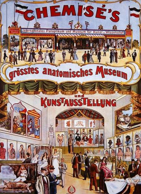Fig. 4 : Inconnu, Affiche publicitaire « Chemise’s Grosstes anatomisches Museum und Kunstausstellungentre », v. 1880-1890, lithographie couleurs, collection particulière.
